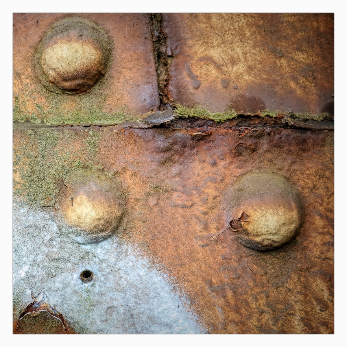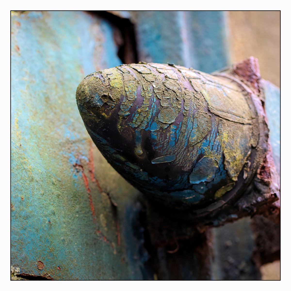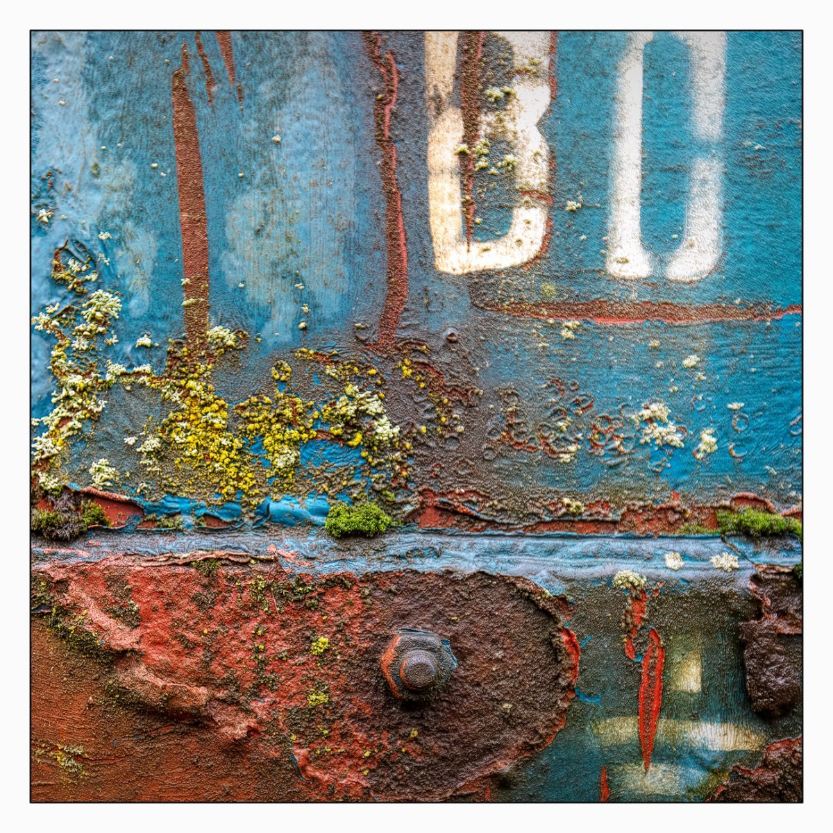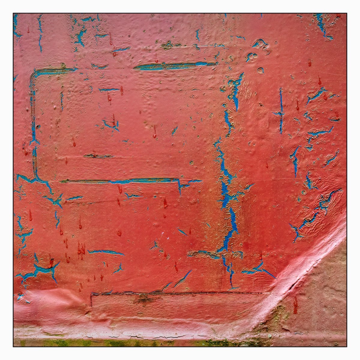 Die Konstellation aus natürlicher, moosiger Verwitterung und menschlicher Gestaltung kann ansprechend sein. So gestalten sich neue Kunstwerke, die durch Auftürmen von Farbe auf Farbe kleine Gebirge und Täler schafft. Witterung durch Hitze und Kälte tun ihr übriges durch feine Risse dazu. Dies wirkt als schaue man auf Landschaften, Landschaften die aus 1ooo Meter Höhe betrachtet werden. Genieße mit mir die Anmutung der kleinen Kunstwerke. Lass Deiner Phantasie freien Lauf.