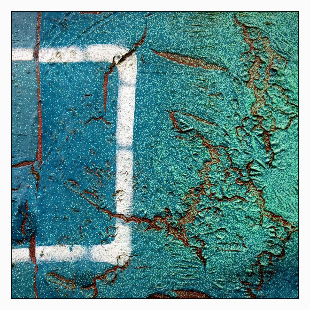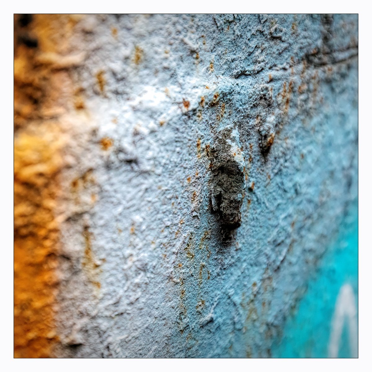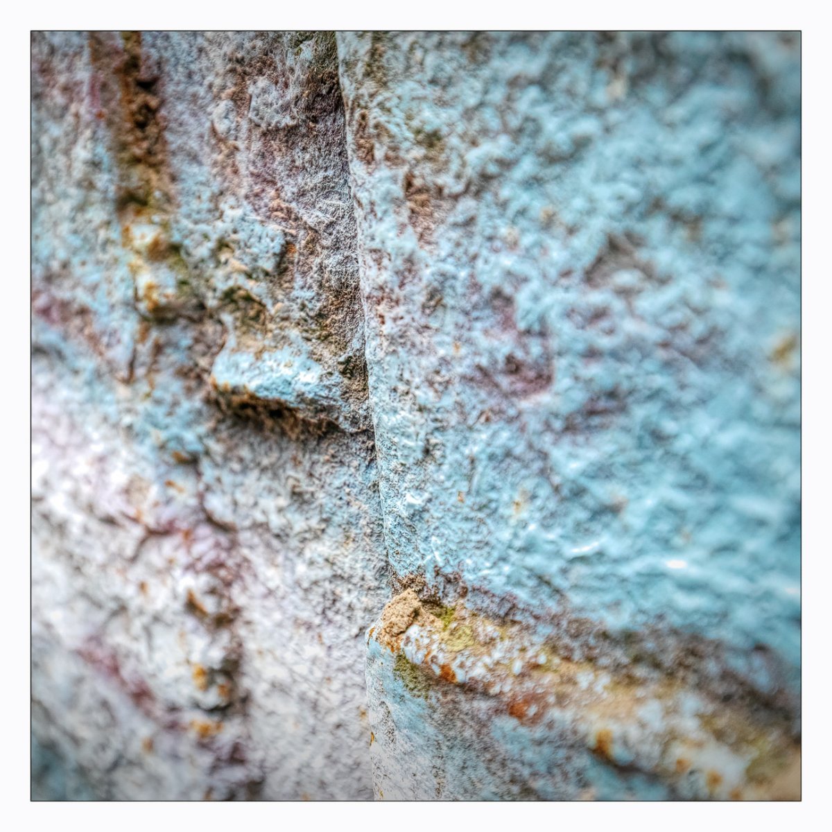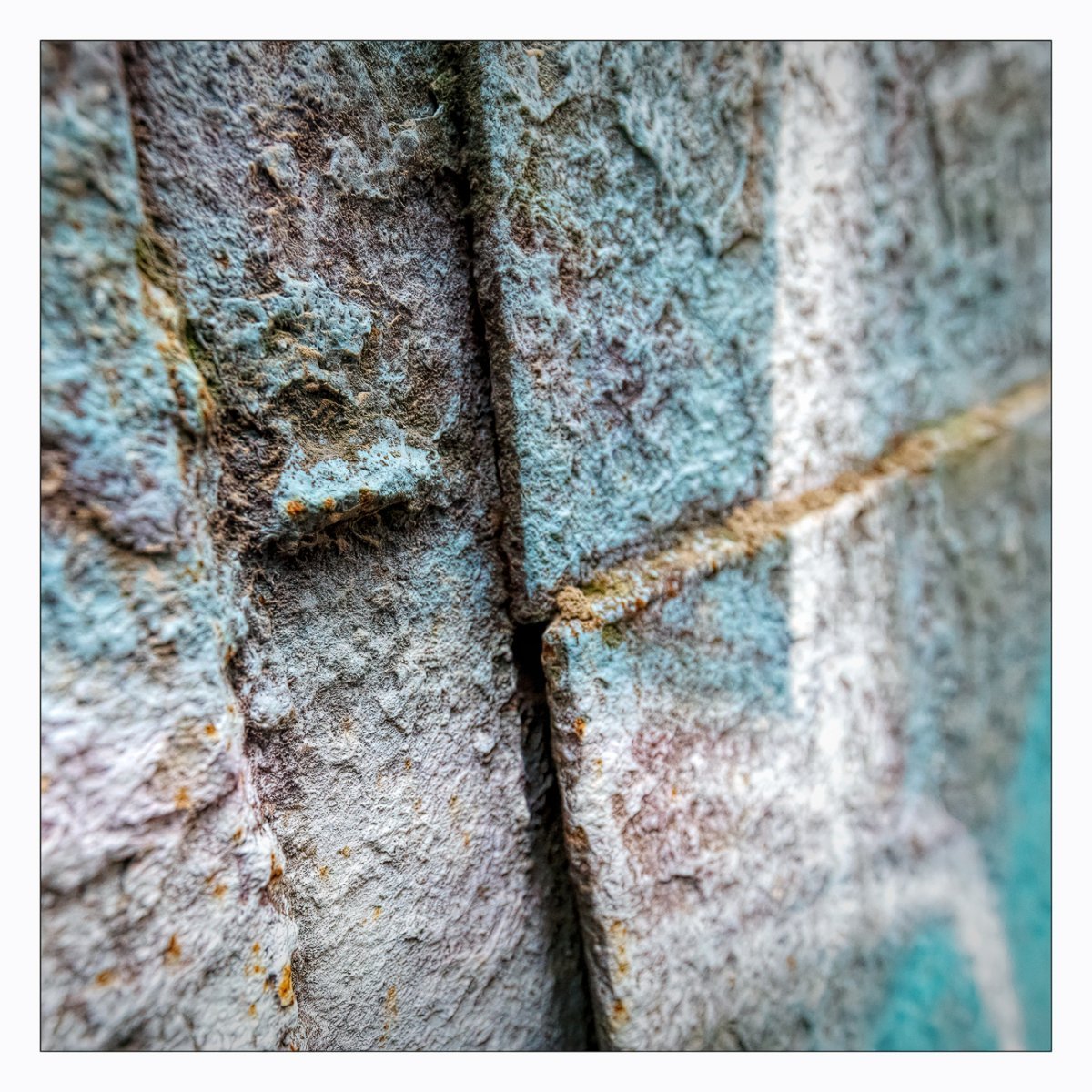 Die Konstellation aus natürlicher, moosiger Verwitterung und menschlicher Gestaltung kann ansprechend sein. So gestalten sich neue Kunstwerke, die durch Auftürmen von Farbe auf Farbe kleine Gebirge und Täler schafft. Witterung durch Hitze und Kälte tun ihr übriges durch feine Risse dazu. Dies wirkt als schaue man auf Landschaften, Landschaften die aus 1ooo Meter Höhe betrachtet werden. Genieße mit mir die Anmutung der kleinen Kunstwerke. Lass Deiner Phantasie freien Lauf.