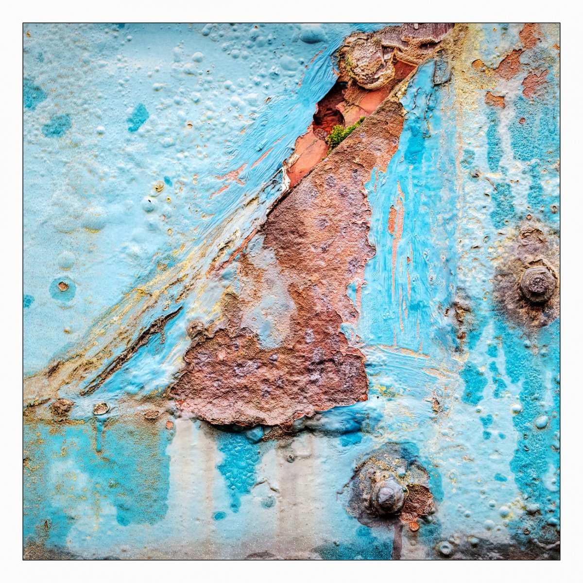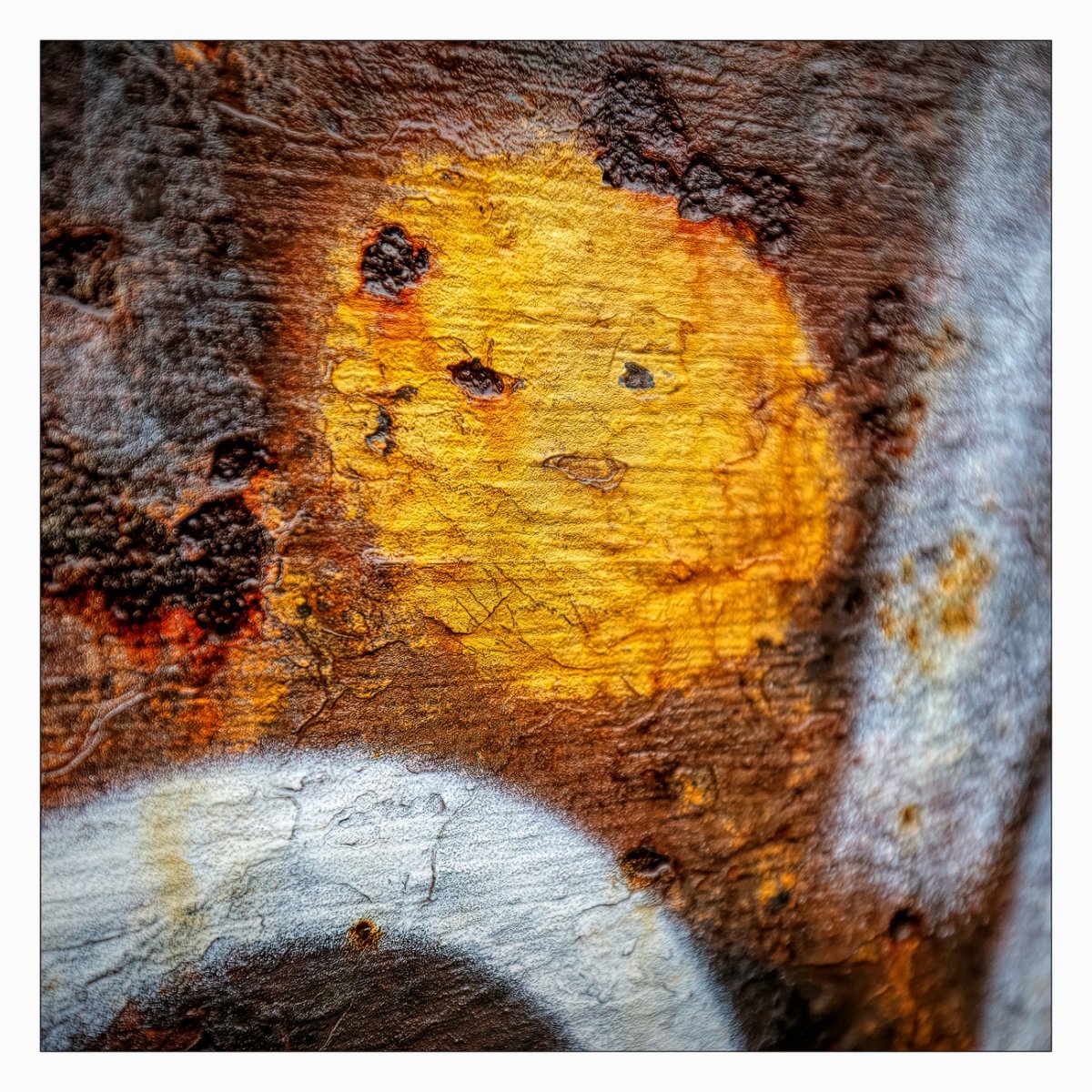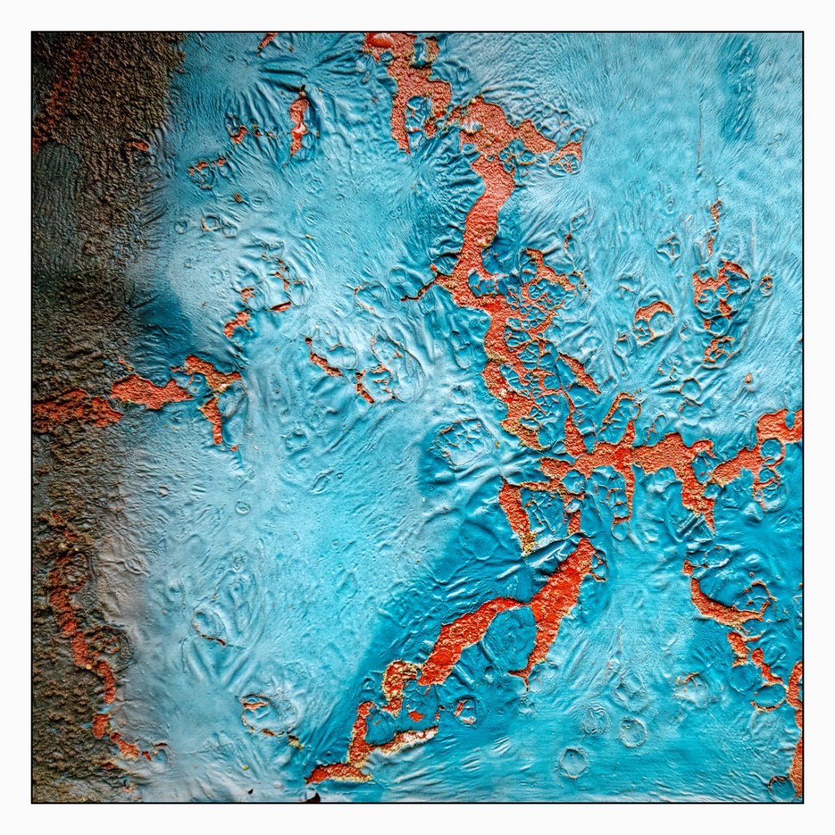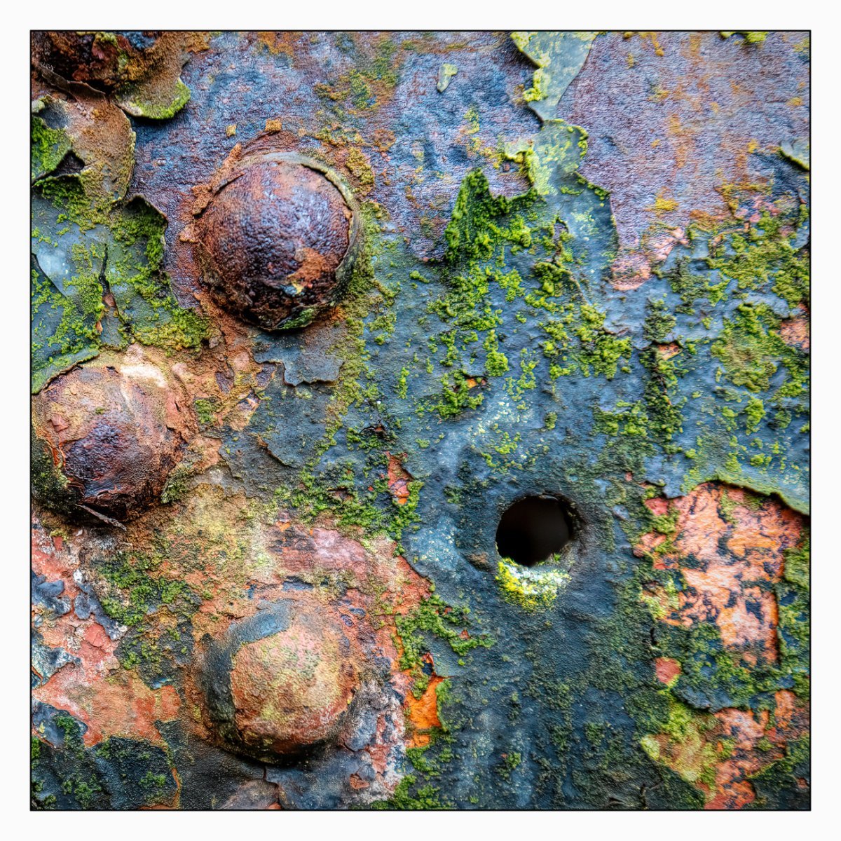 Die Konstellation aus natürlicher, moosiger Verwitterung und menschlicher Gestaltung kann ansprechend sein. So gestalten sich neue Kunstwerke, die durch Auftürmen von Farbe auf Farbe kleine Gebirge und Täler schafft. Witterung durch Hitze und Kälte tun ihr übriges durch feine Risse dazu. Dies wirkt als schaue man auf Landschaften, Landschaften die aus 1ooo Meter Höhe betrachtet werden. Genieße mit mir die Anmutung der kleinen Kunstwerke. Lass Deiner Phantasie freien Lauf.